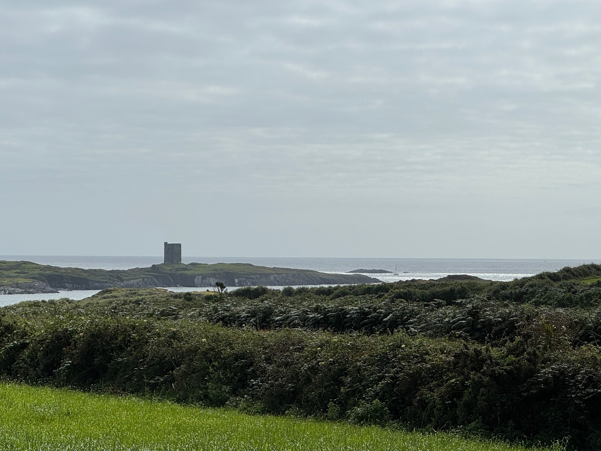 On a commencé par faire un arrêt au LIDL histoire d’avoir de quoi tenir la journée. On est souvent dans les terres sans trop de vue. On fait une pause déjeuner face au château de Kilcoe. Château qui détonne dans le paysage car il est couvert d’un enduit ton ocre qui de loin faisait plus penser à un silo. C’est un domaine privé.
