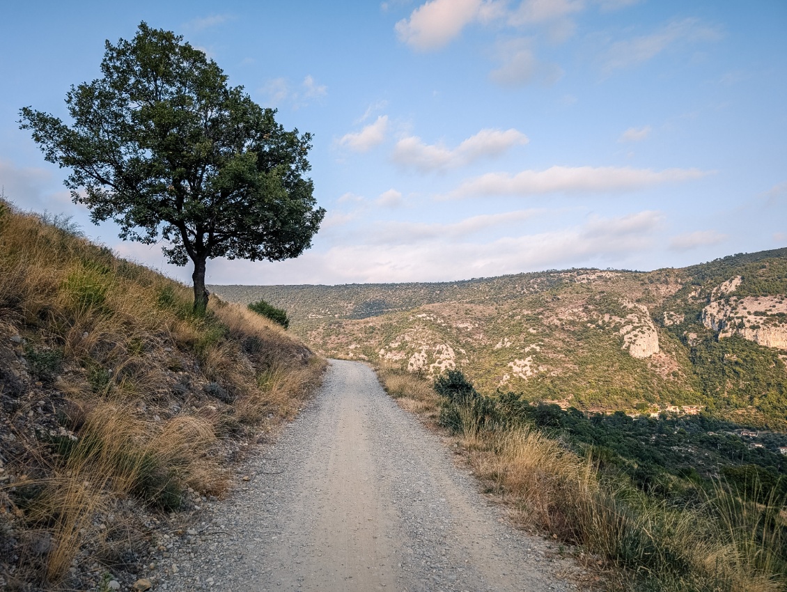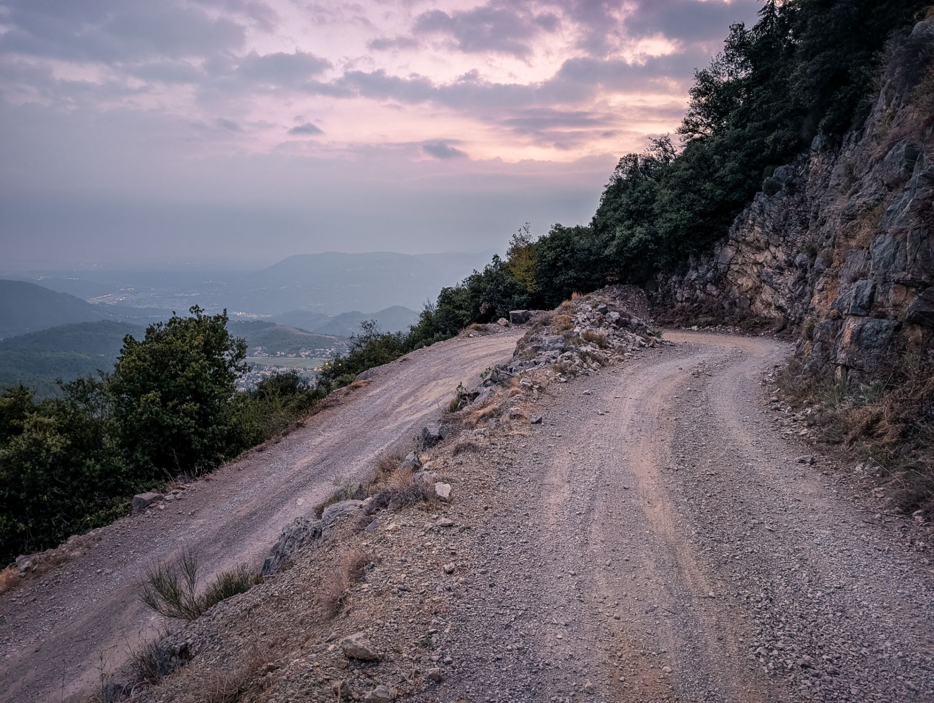La fin de journée joue les contrastes, entre quelques routes saturées en cette fin de journée de travail, et des pistes 5 étoiles, au gravier impeccable et à la vue dégagée. La rédemption arrive sur le mont Férion, une sorte de Ventoux version gravel. Le tumulte s’éteint définitivement au fur et à mesure de l’ascension. Quelques arbres au col de Dragon feront office de toit pour la nuit.