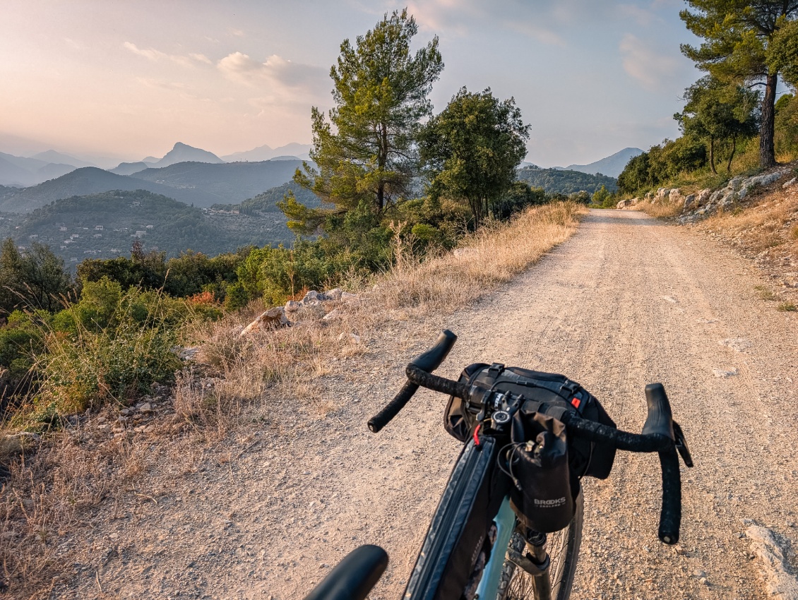 Montagne du Cheiron. L’itinéraire propose deux salles, deux ambiances, de part et d’autre du sommet. Option 1 : “très jolie route de la clue de Gréolières : passage en corniche, à travers des roches, traversée du joli village de Gréolières, vue sur la mer”. Limite le topo me vend le cocktail en terrasse. Option 2 : la version Orangina Rouge (secouez sinon la pulpe elle reste en bas) par Gréolières-les-Neiges. Une station qui portera mieux son nom de Gréolières-les-cailloux aujourd’hui, puisque le topo prévient : “attention, c’est un peu typé VTT, même si ça passe en gravel. On est beaucoup sur les freins, il y a pas mal de cailloux…”. Mais la promesse est-elle aussi prometteuse : “vous êtes tout près de Nice, mais c’est tellement sauvage ! Vue mer et montagne… L’un de nos gros coups de coeur”. Tout était vrai : le champ de mines géologique est aussi inoubliable que la vue. Gros respect sur la fourche suspendue qui a encaissé bien plus que mes bras, pour cette longue descente sauvage.