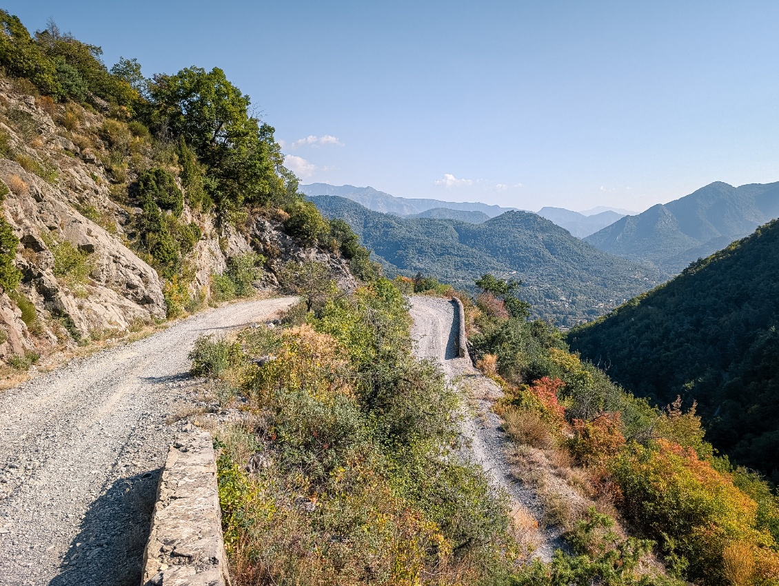 Je vire donc vers l’est, pour rejoindre ce tracé sur les hauteurs de Sospel, par un dédale de routes sinueuses quasi désert. On en oublierait presque que la côte d’Azur est si proche. Puis je file vers l’Italie par le joli col de Vescavo, avant de basculer vers un nouveau purgatoire : la vallée de la Roya et sa route encaissée, fréquentée, et truffée de tunnels. L’ancienne route – en décrépitude – permet d’y échapper, parfois dans une ambiance zone industrielle en friche.