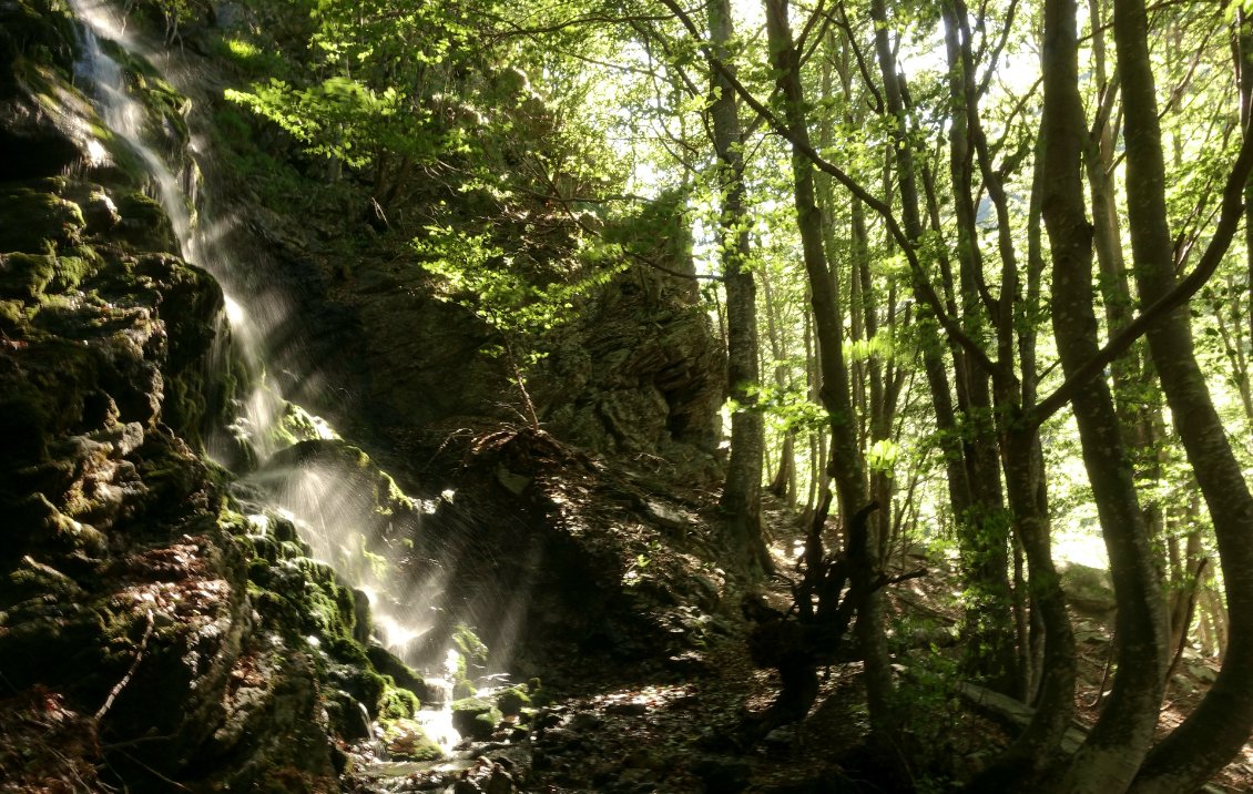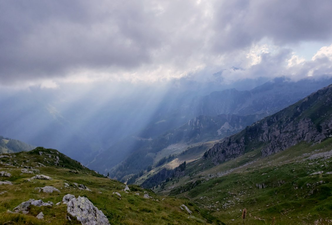 Je quitte le Piemonte et me retrouve dans le Val Formazza. J'ai deux possibilités pour rejoindre Locarno au Nord du laggo Maggiore : descendre à Verbania et longer le lac, ou bien traverser le Parque Natural de Val Grande. Je choisis cette seconde option et monte dans ce nouveau petit massif, qui est dit-on la plus grande réserve natuelle d'Europe. Après une longue journée de 25 km et 2200m de dénivelé positif pour arriver dans le parc, je prevois de faire des demi-journées de marche pour prendre le temps de me reposer et d'apprendre l'italien à l'aide d'un manuel téléchargé sur ma liseuse. Ce ne sera pas le cas puisque j'aurai toujours de la compagnie dans les bivaccos où je passe mes nuits. Ces bivaccos sont les refuges non gardés italiens, très bien entretenus et respectés. Il y en a beaucoup en Italie, et particulièrement dans le Val Grande. Décidément, en dehors zones très touristiques, tous les italien•nes que je rencontre sont super sympas ! Une chance pour moi, l'anglais est couramment parlé, ce qui ne m'encourage toutefois pas à apprendre l'italien qui est une si belle langue. Je marche dans de paisibles forêts de hêtres, dont l'ombre permet d'avaler du dénivelé sans difficulté. Dans les hauteurs, je vois l'étendue du laggo Maggiore, et au loin, Milano et la plaine au Sud des Alpes. C'est à me demander pourquoi je passe par les montagnes pour me diriger vers l'Est. Pour être dans ce genre d'endroits justement. Lors de la dernière journée dans le parc, je pensais à nouveau marcher un peu puis arriver tôt à un bivacco, mais les 6 derniers kilomètres empruntent un sentier délicat qui n'existe presque plus. Ce n'est pas spécialement dangereux, mais je trébuche sans arrêt sur ce sol ondulé à flanc de montagne, couvert de buissons et d'herbes hautes. J'avance à 1 km/h et j'ai soif. Ce n'est pas grave, juste fatiguant, et ça fait parti du jeu cela aussi. Au moins, sur la fin, j'ai en recompese un passage de descente en rappel avec des chaînes installées sur la falaise, ce qui a un certain panache. J'arrive fatigué à 20h au bivacco, et la source indiquée sur la carte est à sec. J'étudie rapidement les différentes possibilités d'adaptation, et tant pis, je ne vais pas marcher encore une heure ou deux pour trouver de l'eau : je prends l'eau croupie d'un viel abreuvoir et bouche progressivement mon filtre avec. J'ai alors suffisamment d'eau potable, et prendrai le temps nécessaire pour déboucher mon filtre au prochain point d'eau courante. L'aventure est une pièce à deux faces dans laquelle on met les deux pieds. Après cette longue après-midi éreintante alors que l'idée initiale était de me reposer, j'ai à ma disposition un bivacco juste pour moi, de quoi me restaurer, et la soirée devant moi. Je me fais un beau feu dehors sur lequel je cuisinerai un bon repas. Quelqu'un a laissé la fin d'une bouteille de shnaps, j'en ferai mon affaire. Je savoure tout ça en contemplant mon feu et les étoiles d'une belle nuit claire sur les montagnes, en écoutant de la musique, sans me soucier de l'heure. Je l'ai, mon moment de détente.