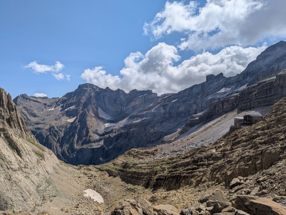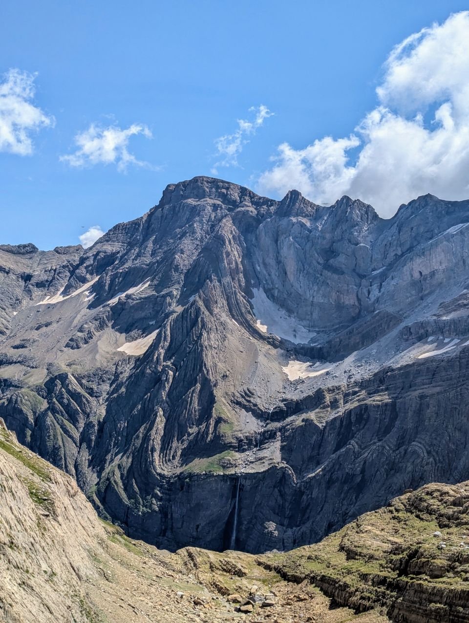 Après 1h de marche, on atteint le cirque ! C'est nuageux mais on voit quand même la cascade donc on est super content. 📸 En bas, il a un vieil hôtel et pleins de touristes. En fait, le cirque de Gavarnie est touristique depuis le XVIIIeme siècle. Les bourgeois venaient se soigner aux thermes de la région et aussi admirer le cirque !