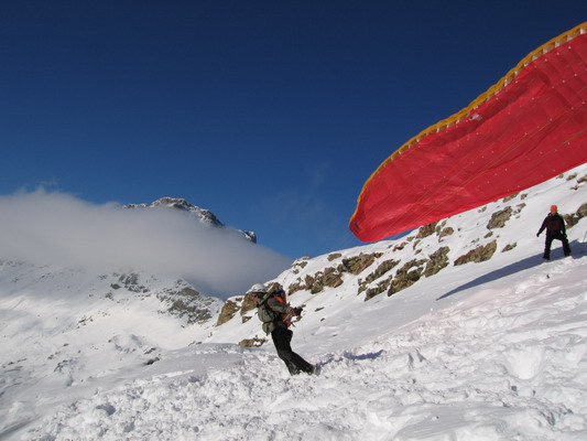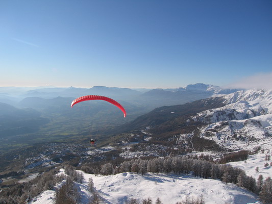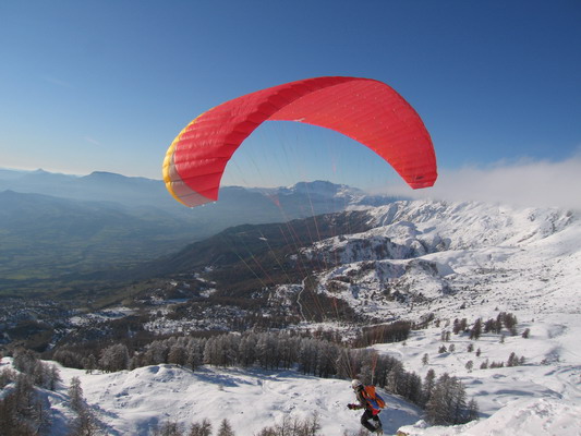 Le week-end dernier on a testé le décollage du col de Gardette (entre les aiguilles de Chabrières et la Pousterle) dans la neige bien molle et atterrissage à la maison. Enfin pas vraiment nous, des copains, nous on est redescendu à ski et c'était bien aussi