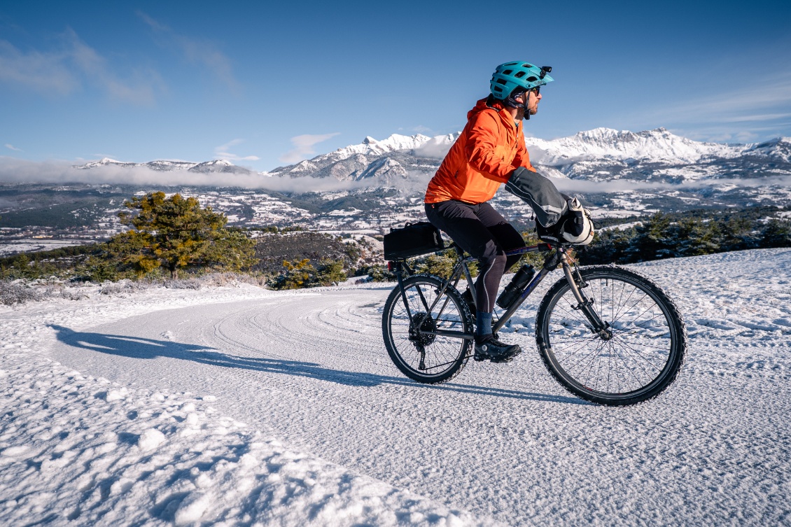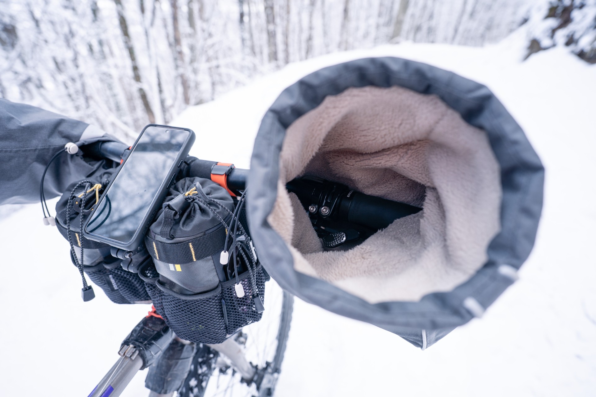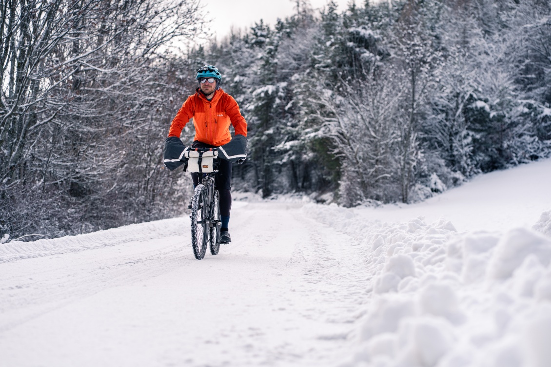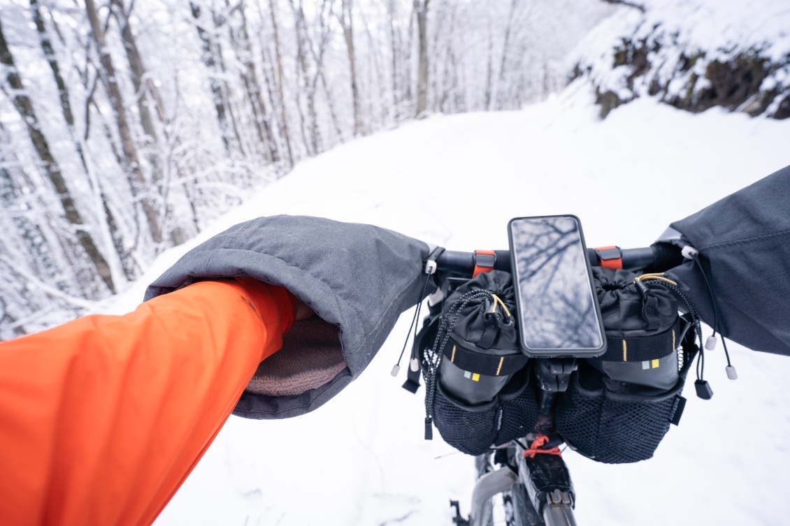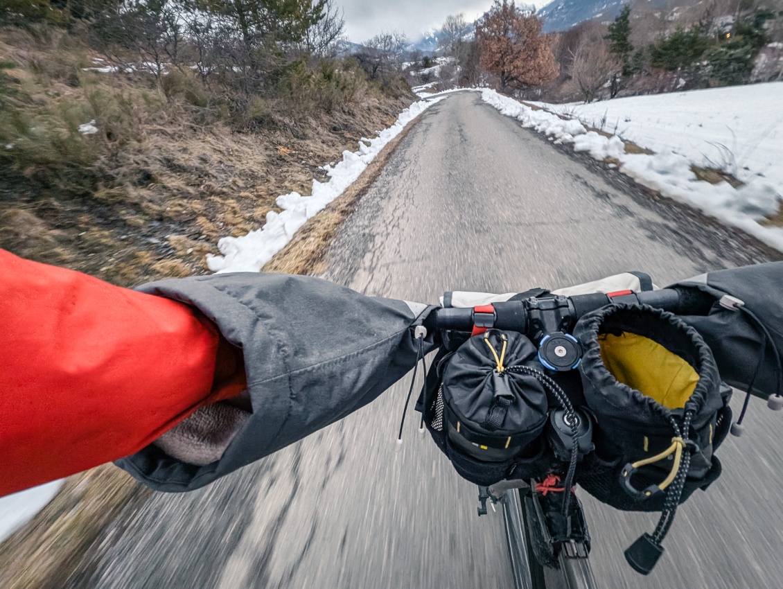 Pour moi, les manchons incarnait l’image d’Épinal du grand Nord. Un accessoire porté soit par les vélotafeurs canadiens de l’extrême, qui bravent les tempêtes de neige, soit par l’aventurier en fatbike, qui traverse les latitudes nord en hiver. À l’instar du bien nommé modèle expédition, fabriqué par Revelate Designs. Pour nos hivers européens, je jugeais l’engin un poil surdimensionné, un peu comme si l’on sortait le chasse-neige pour déneiger une terrasse.