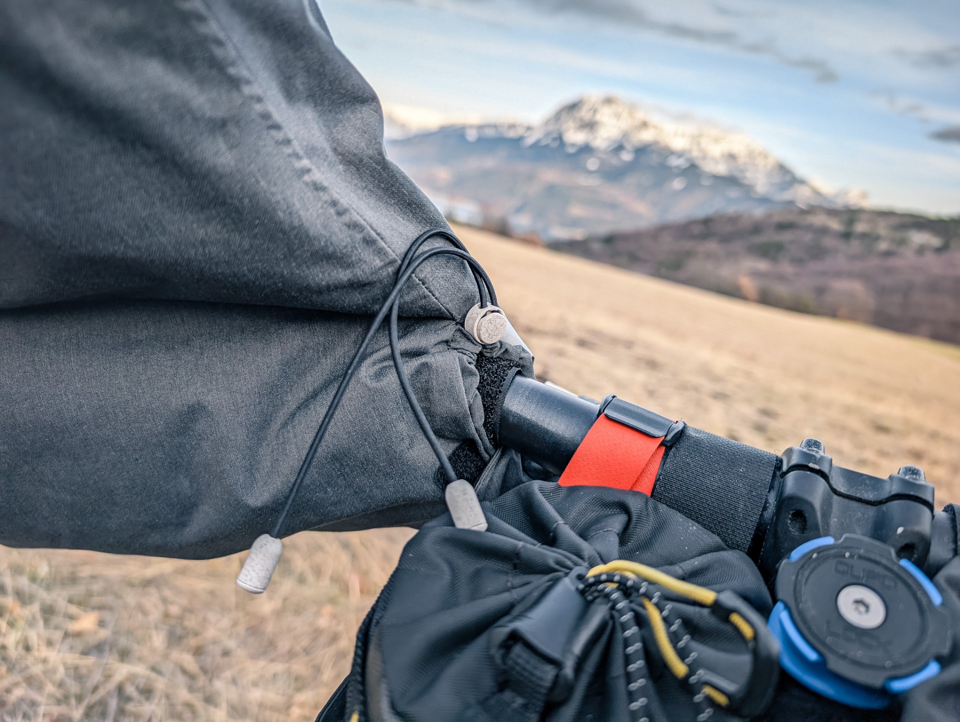 La construction de ces manchons est assez basique, et c’est précisément dans cette simplicité que se cache son principal talon d’Achille. Contrairement au modèle haut de gamme évoqué précédemment, qui se verrouillent en bout de cintre via des embouts de guidon dédiés, la version BTWIN se contente d’un modeste scratch côté potence. La gravité faisant son œuvre, le manchon a tendance à s’affaisser, à se mettre de travers. Il reste bien arrimé, mais ne protège pas aussi bien. Selon l’épaisseur des vêtements portés, la forme du cintre, des leviers de freins et des poignées, les manchons tiendront plus ou moins dans l’axe. Dans mon cas, l’équilibre est précaire mais tient la route, moyennant parfois quelques repositionnements en cours de route.