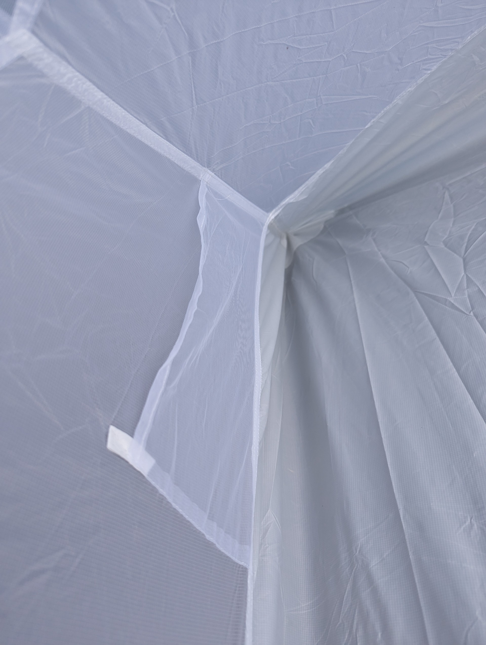 Cette tente, très facilement convertible en tarp ultra spacieux, se remarque aussi par sa teinte, ou plutôt son absence de teinte. À priori cette étape de la fabrication est très émettrice en CO2 (17% du total selon le calcul mentionné par la marque) et n'est pas vraiment indispensable. Bon, un abri blanc, ça se remarque, on aime, ou pas