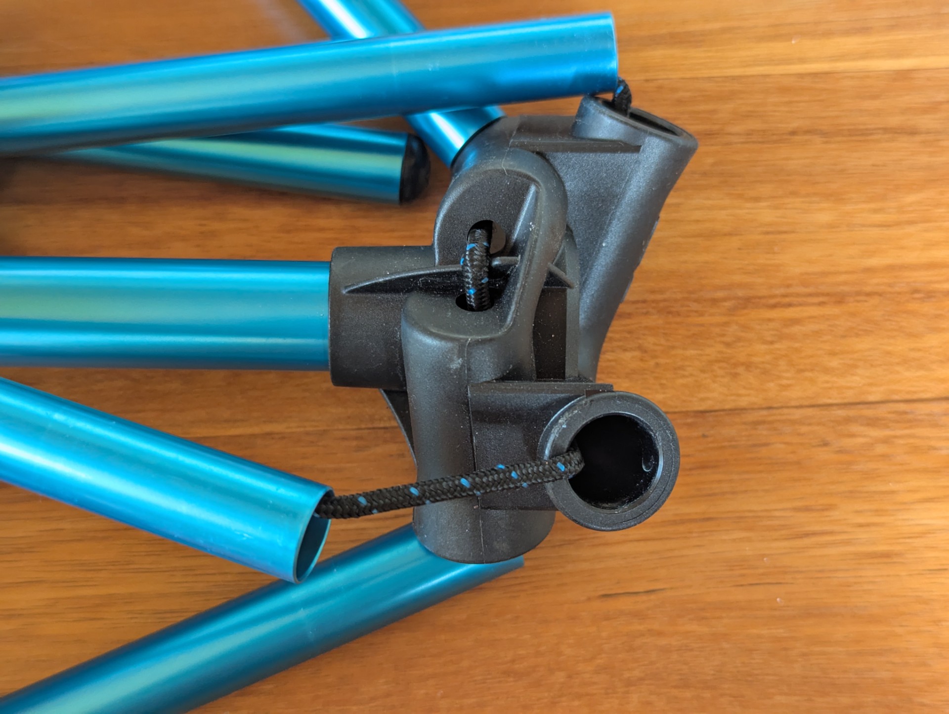 Avant de parler du confort, la Chair Zero se distingue par son rapport ingéniosité / simplicité de montage. Lorsque l’on ouvre le sachet de rangement (fermé par un cordon avec crochet de serrage), on trouve d’une part :- le treillis de tube d’aluminium DAC reliés par des connecteurs et des tendeurs, le diamètre des tubes et l’ensemble inspire confiance, et est évident à monter, il suffit d’aider les tubes à s’emboiter naturellement les uns dans les autres.