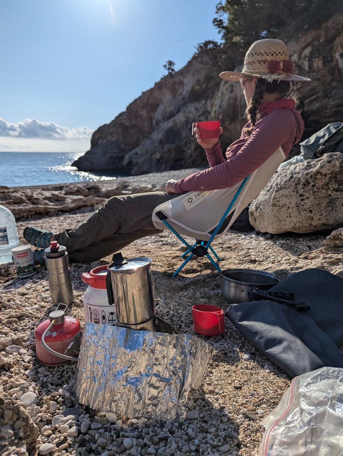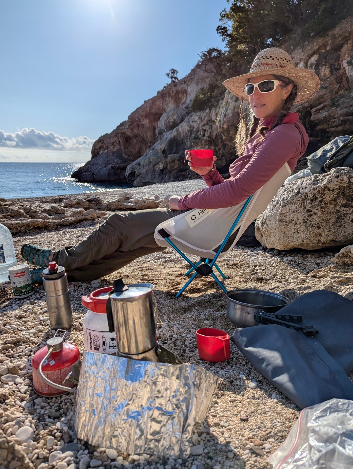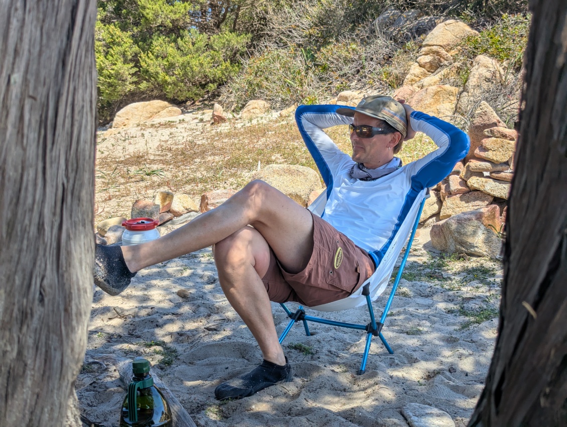 Assis, le confort est immédiat. Le centre de gravité est bas, l’assise est proche du sol (une fois assis, le bas des fesses se trouve à environ 20 cm du sol ; la hauteur totale au sol est de 64 cm) et plutôt profonde (31 cm) : les fesses descendent bien s’y caler. Le dossier remonte bien dans le dos, quasiment jusqu’aux épaules (43 cm environ du bas des fesses jusqu’en haut du dossier), c’est vraiment confortable. La largeur est également agréable pour une personne de gabarit standard (la Chair Zero fait 51 cm de large au niveau des épaules et 50 sous les genoux).Attention, si l’on garde les jambes pliées classiquement, on peut avoir tendance à basculer sur l’arrière si l’on se penche un peu* ; bon, on ne tombe jamais de haut ceci dit. En étendant les jambes vers l’avant (voir photos), cela stabilise bien l’ensemble qui ne bascule plus du tout, et la position est super confortable et permet une réelle détente du corps, membres et dos/abdominaux inclus.Et puis, le petit café du matin (ou le petit verre de vin le soir – oui, nous emportons des cubis de vin dans les caissons étanches de nos kayaks) siroté installé.e confortablement face à la grande bleue a vraiment un charme particulier !