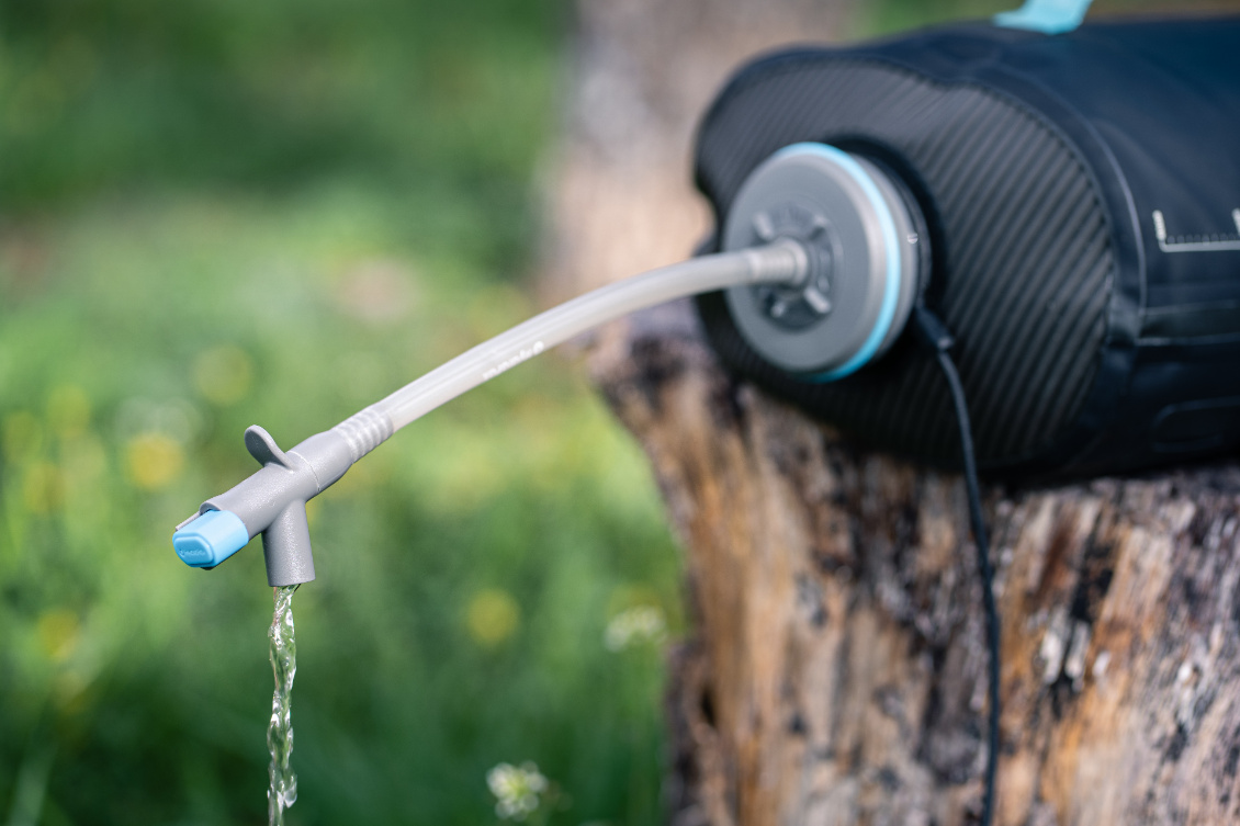 Côté filtration : nous avons voulu tester ce réservoir car, d’après sa fiche technique, il est décrit comme compatible avec les filtres à eau... Or, son bouchon présente un diamètre de 63mm, tandis que les filtres classiques sont plutôt en 28 mm ou 42mm. Nous avons donc utilisé l’embout fourni avec le modèle Pioneer 10 L de la même marque (Hydrapak le vend séparément sinon) : celui-ci permet d’utiliser des filtres LifeStraw, Quickdraw ou Sawyer par exemple.