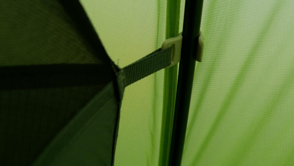 Le montage de la tente est facile. L’arceau principal asymétrique se déplie rapidement et se fixe sans difficulté avec des clips sur la chambre. Un arceau complémentaire se fixe presque à l’horizontal au dessus de la chambre afin d’en augmenter le volume habitable.