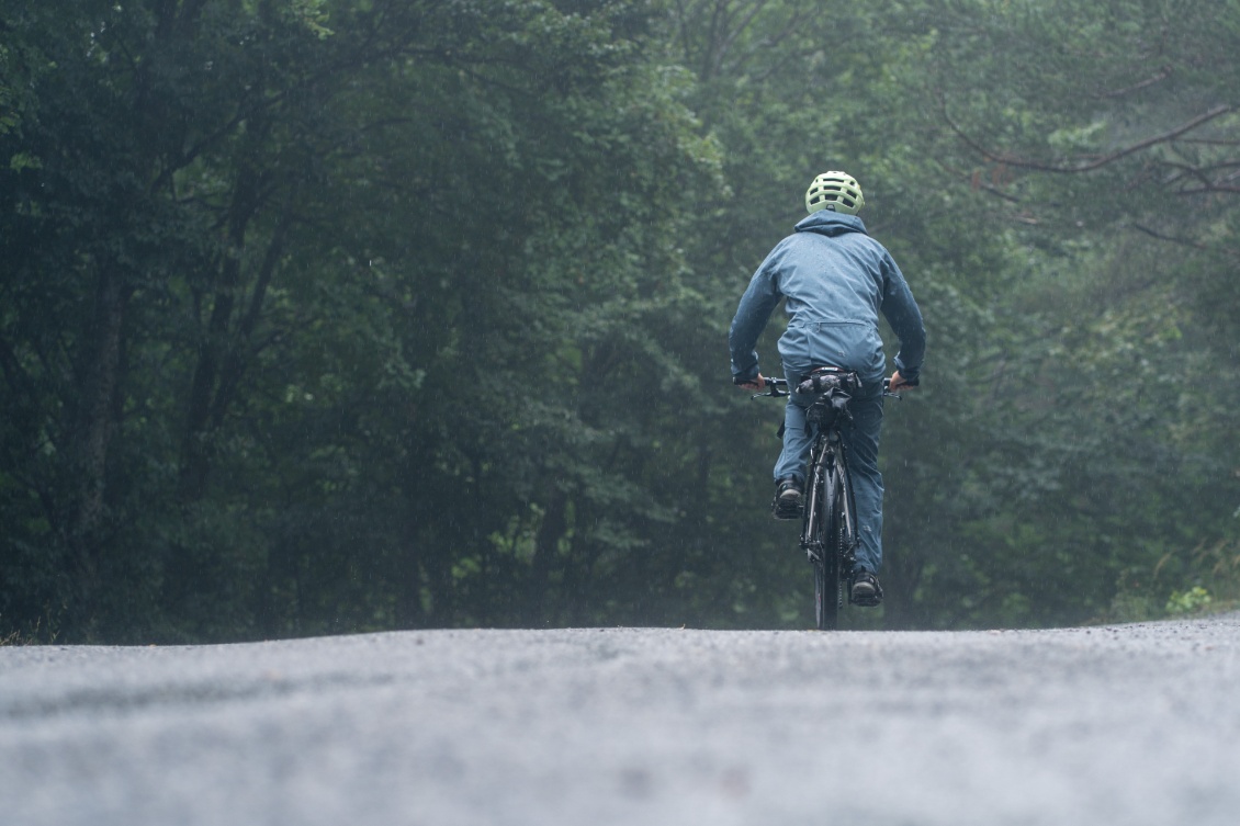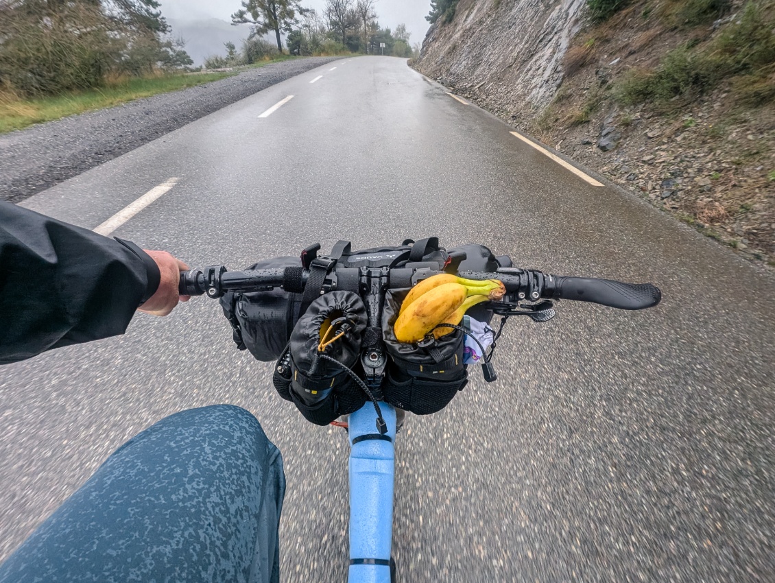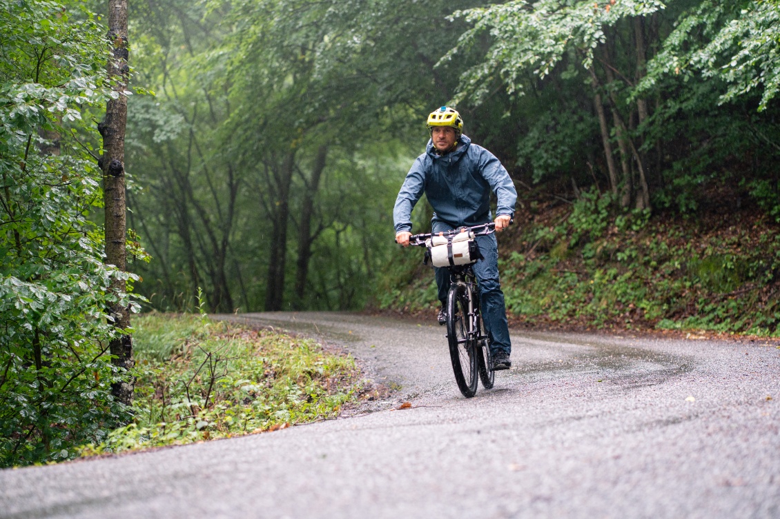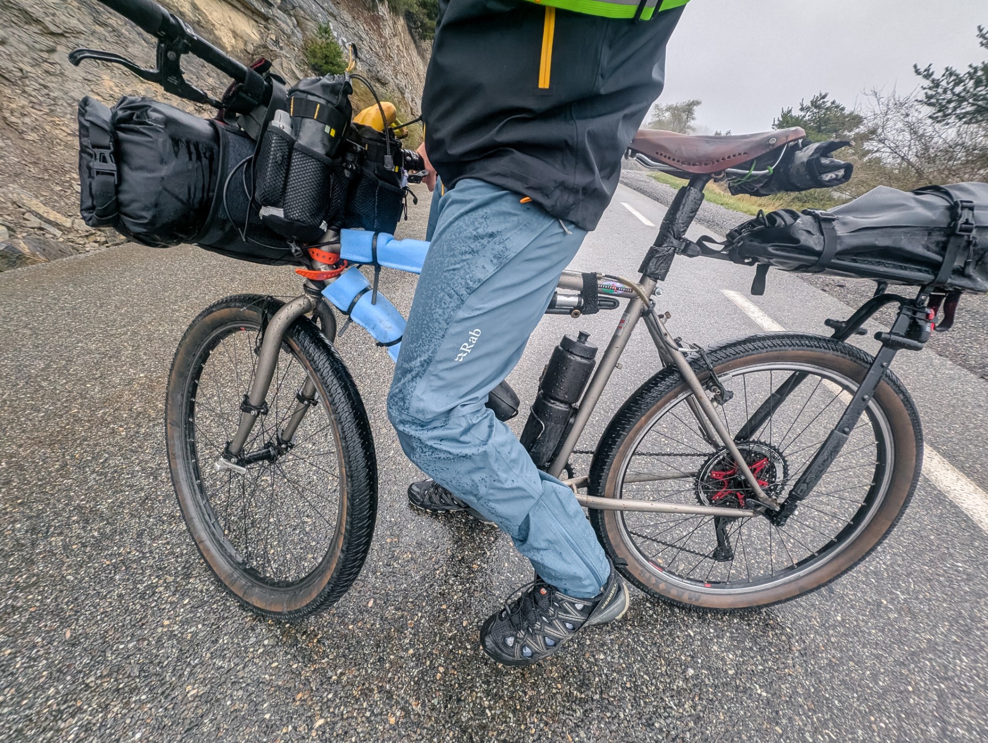 Lors de voyages comme notre traversée à vélo+ski, ces solutions ne convenaient pas : il était nécessaire de pouvoir rouler sous la pluie pour aller chercher le beau temps plus loin, parfois quand le mercure dépasse tout juste zéro. L’occasion idéale pour tester des vêtements étanches de la gamme Cinder : le pantalon testé ici et la veste éponyme.