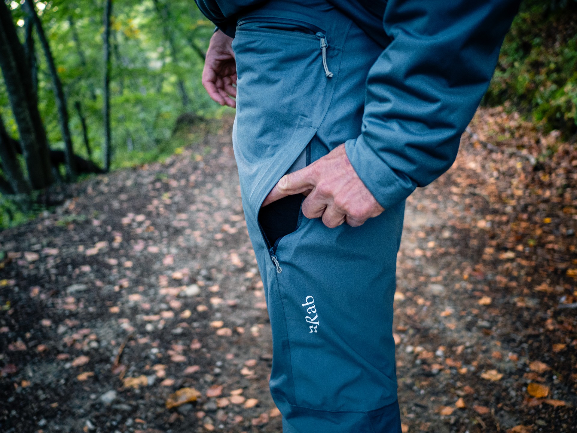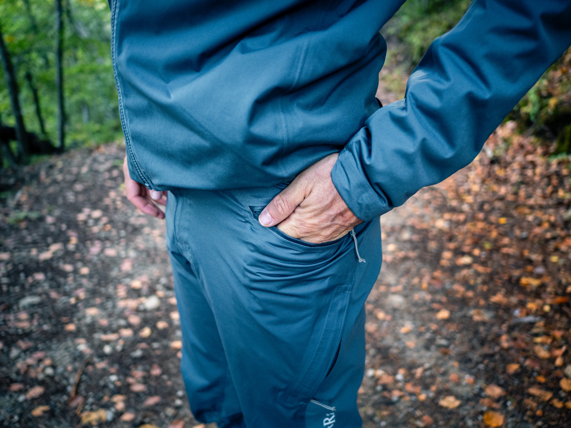 - Poches : souvent absentes sur les pantalons étanches, le Cinder Kinetic dispose d’une poche de chaque côté, fermées par zip étanches. Elles sont d’une taille très correcte (on peut y glisser un smartphone) et surtout, sont placées latéralement ; un choix judicieux pour éviter toute gêne en pédalant. Attention toutefois, RAB prévient du risque de condensation dans ces poches : elles ne sont pas construites pour être des compartiments étanches (ce qui est le cas pour tous les vêtements techniques de ce genre, même très haut de gamme). Pour du matériel sensible (électronique par exemple), il convient donc de doubler avec une pochette étanche.