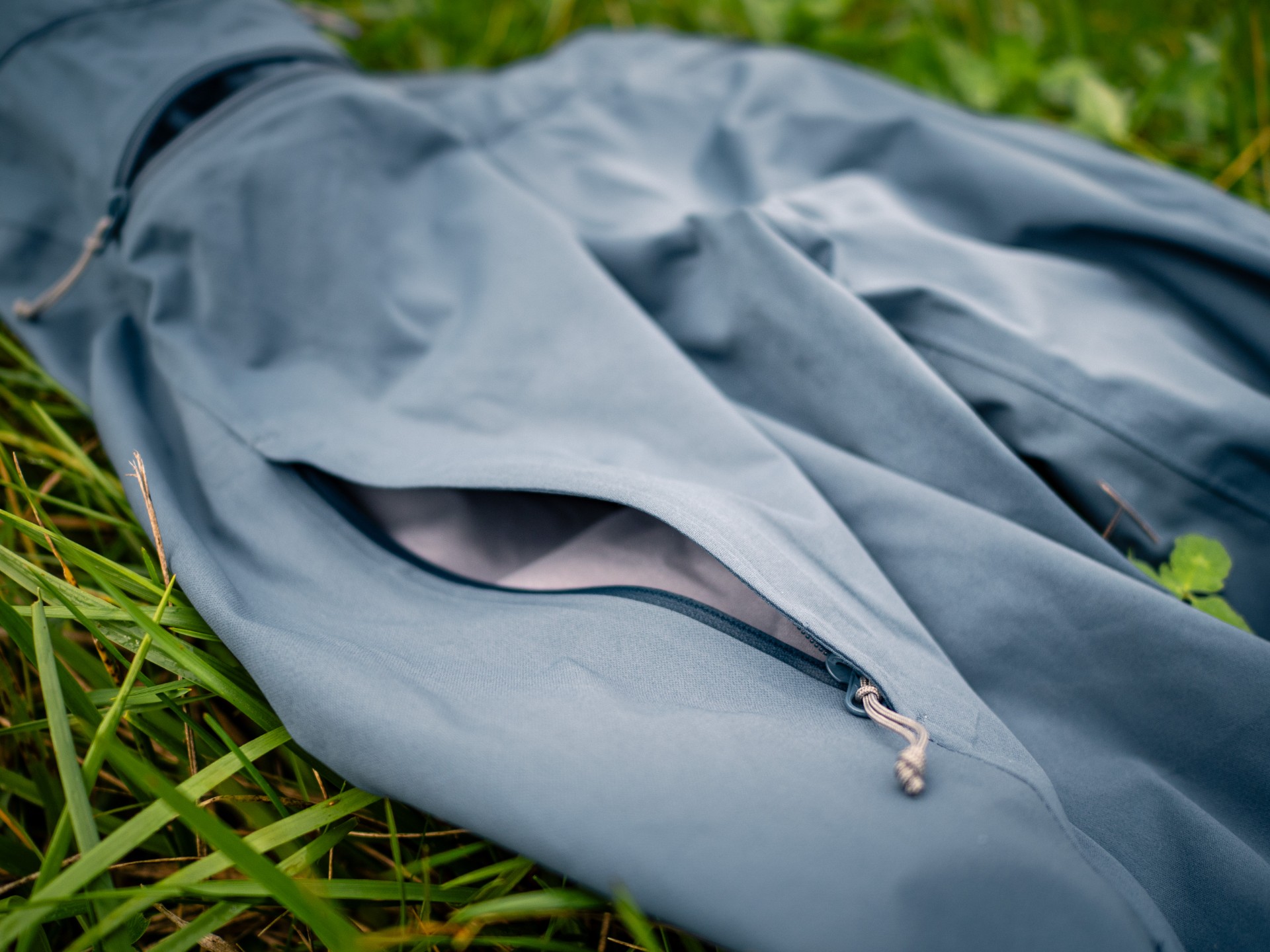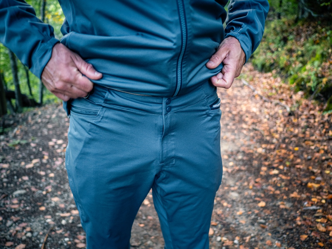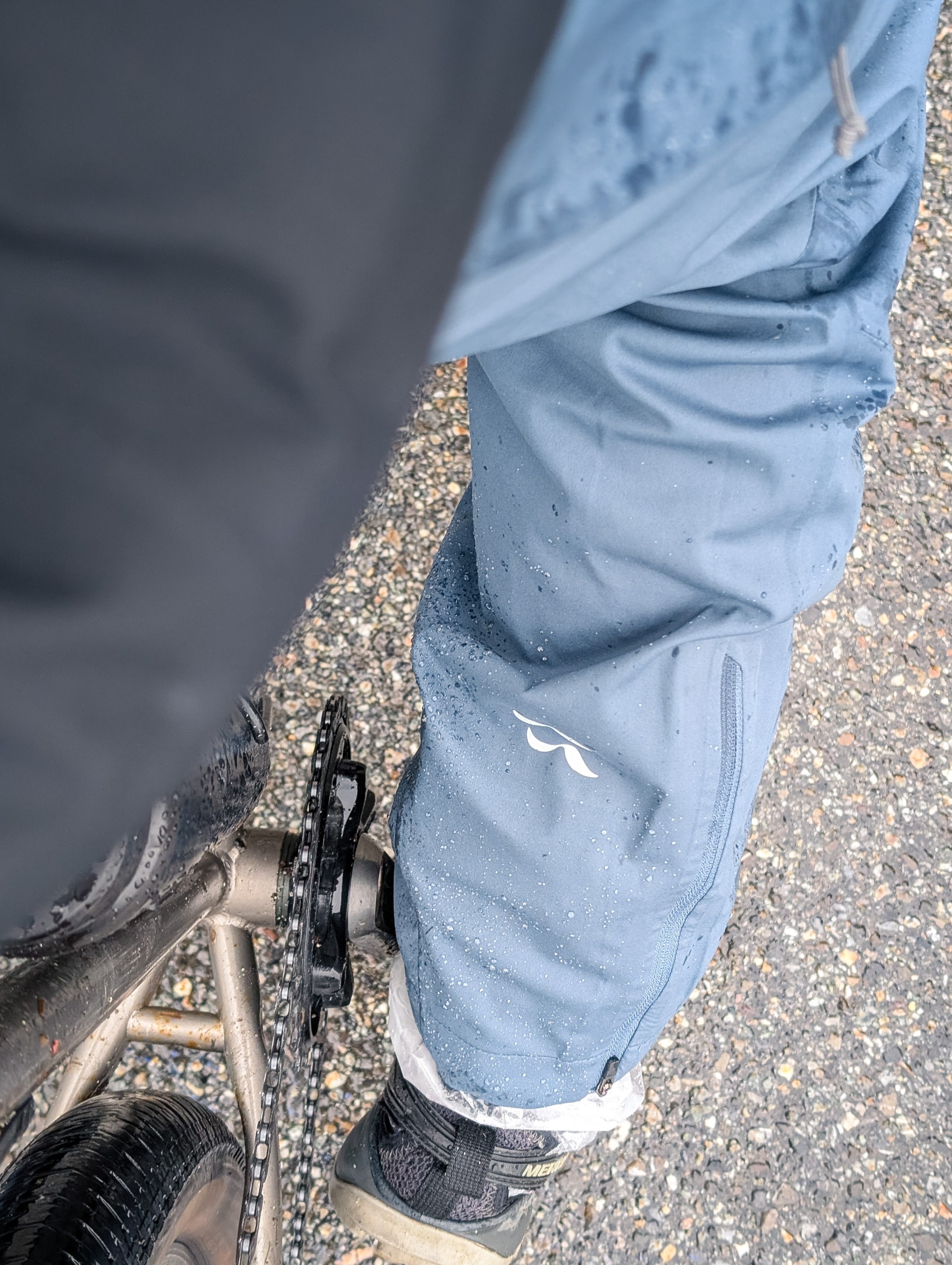 Le pantalon dispose d’un petit zip en bas des jambes pour en agrandir la taille. Je ne l’ouvre jamais à vélo (pour ne pas toucher la chaîne), mais il peut être utile dans d’autres activités (selon les chaussures utilisées par exemple). En revanche, il ne permet pas d’enfiler le RAB Cinder Kinetic sans retirer ses chaussures, contrairement à certains surpantalons équipés de zip ¾ (ou +). À sa décharge, de plus longues fermetures éclair auraient aussi pu compromettre le confort, en alourdissant le pantalon, et en ajoutant de nombreuses coutures (donc de potentiels frottements).