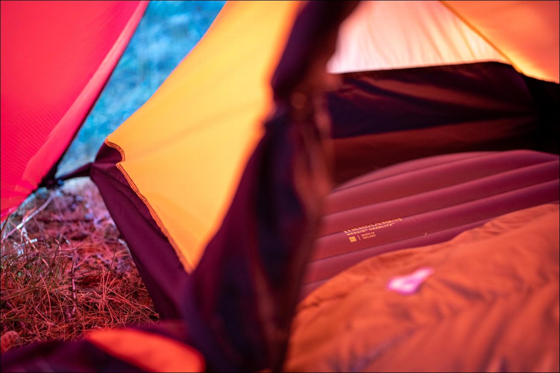 Bien sûr, cette cure d’amaigrissement ne se fait pas sans compromis. Le premier, le plus évident, est le matériau de fabrication : l’enveloppe (dessus et dessous) est constituée d’un Nylon 15D, là où le X-Lite utilisait du Nylon 30D Ripstop. Au toucher, la différence est flagrante tant le tissu semble fin et léger. D’ailleurs, après une longue utilisation de l’Uberlite, quand j’ai réutilisé occasionnellement le X-Lite, j’avais l’impression que ce dernier était en tissu renforcé ! Est-ce que la durabilité en pâtit ? Pas à ma connaissance, mais nous y reviendrons plus loin.L’autre compromis est sa capacité d’isolation : la R-Value est de 2.3, alors qu’elle est de 4.2 pour le X-Lite. L’allègement a donc aussi été obtenu par une simplification de la structure interne, et donc une diminution de son pouvoir isolant. Toutefois, une telle R-Value permet d’envisager sereinement ses bivouacs estivaux, voire plus. Nous y reviendrons également plus loin.