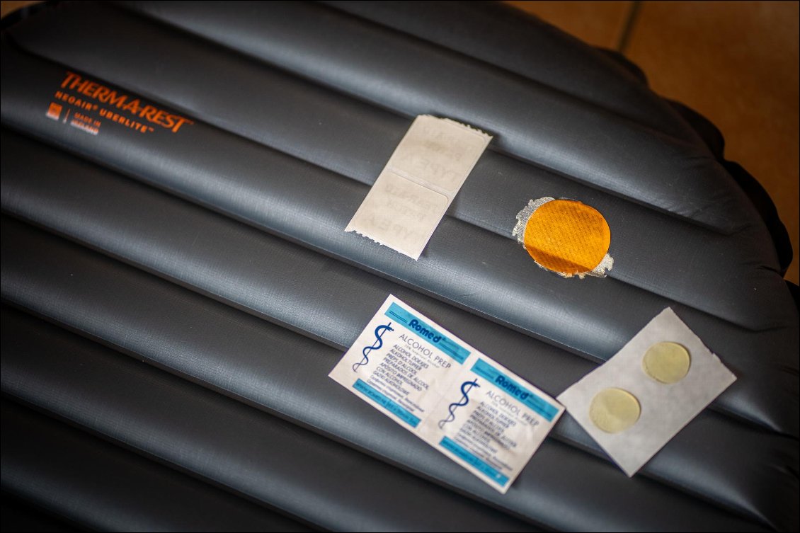 Avec l’Uberlite, j’ai toujours été particulièrement attentif : gonflage, dégonflage et pliage dans la tente, jamais dehors, pas d’objets tranchants dans la tente… Certains appelleront ça de la maniaquerie ! En tout cas, en le traitant de la sorte, le NeoAir remplit parfaitement son rôle, sans souci. Bon, sauf une fois… où je lui ai mis un coup de couteau en plein dedans, en mangeant dans la tente ! La boulette, je crois qu’aucun matelas n’aurait résisté ! La réparation sur le terrain n’a pas été très efficace (je n’avais que du Duck Tape), mais heureusement, le lendemain, j’ai pu la réparer chez un ami avec le matériel adéquat. Depuis, cette réparation n’a pas bronché.