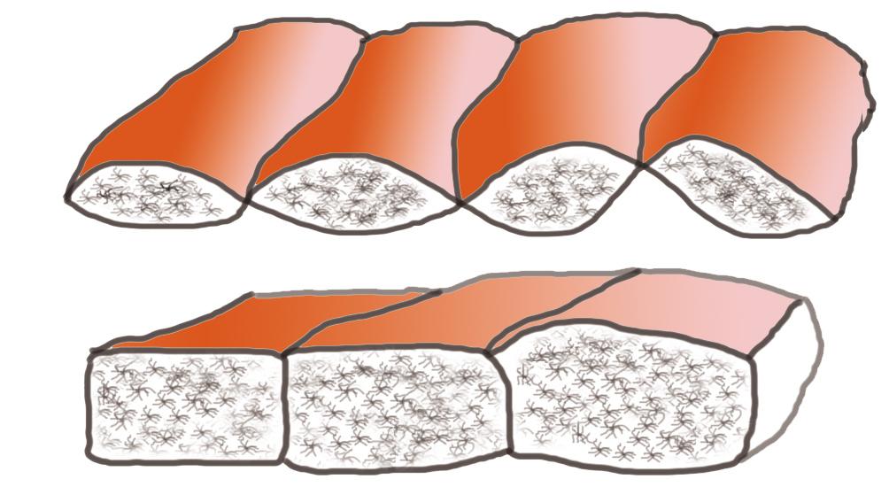 En haut, construction classique et économique mais avec des pertes thermiques entre les boudins.